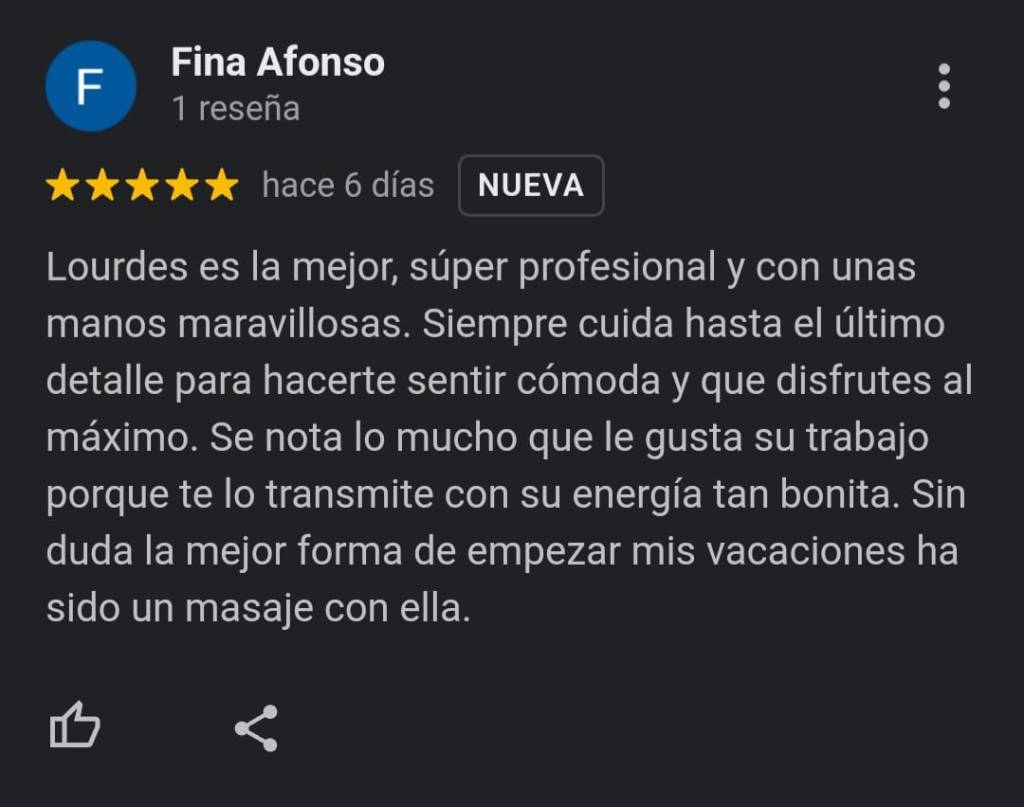 Bienvenidos a mi rincón, donde la pasión por el bienestar se encuentra con la experiencia profesional. Soy Lourdes, masajista con más de 10 años de trayectoria dedicada a cuidar y revitalizar todo tipo de pieles. Desde el primer contacto hasta el último suspiro de relajación, mi compromiso es ofrecerte un servicio personalizado que priorice tu bienestar y tranquilidad.